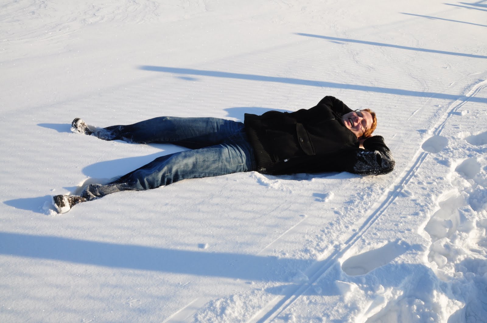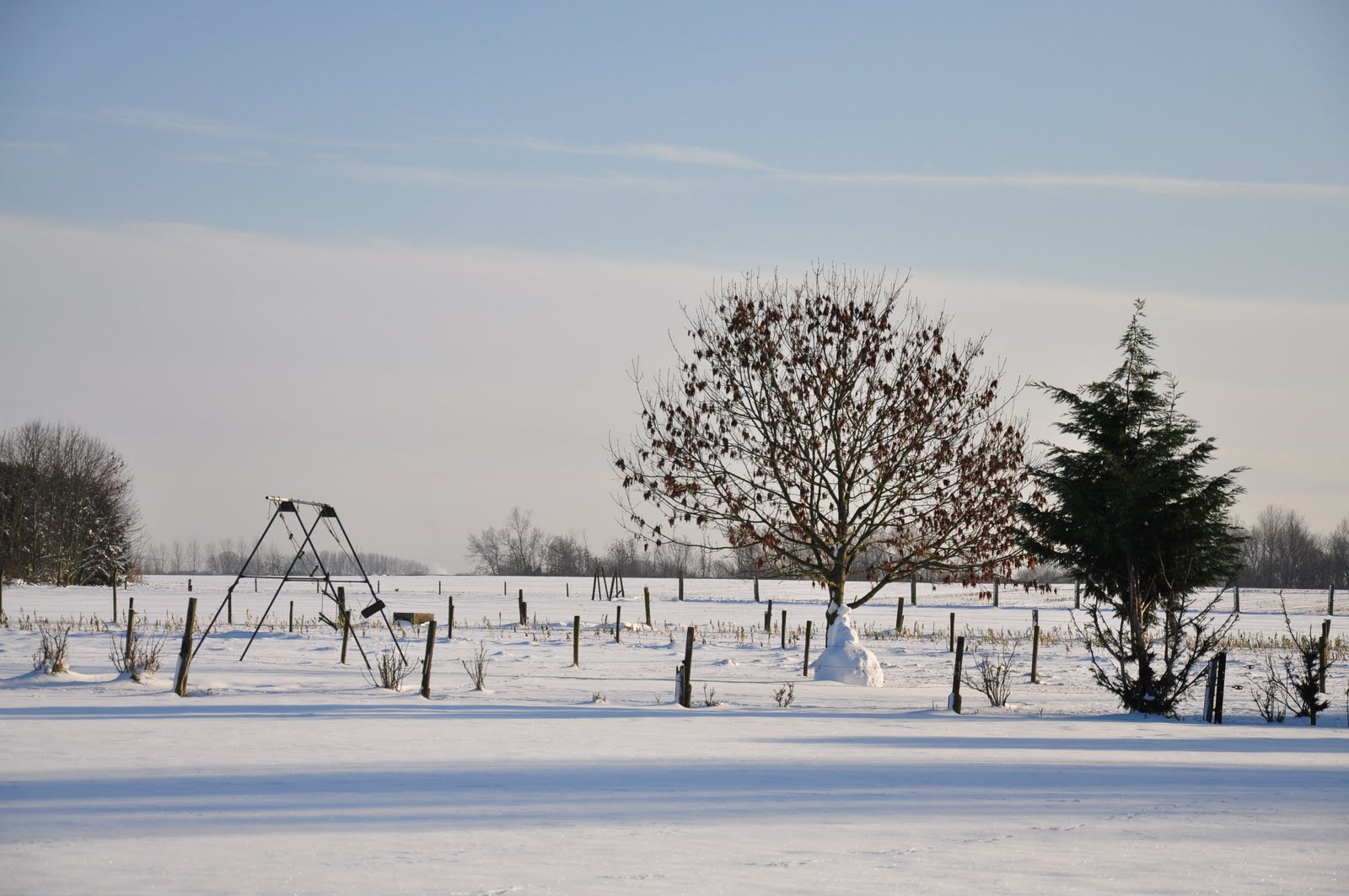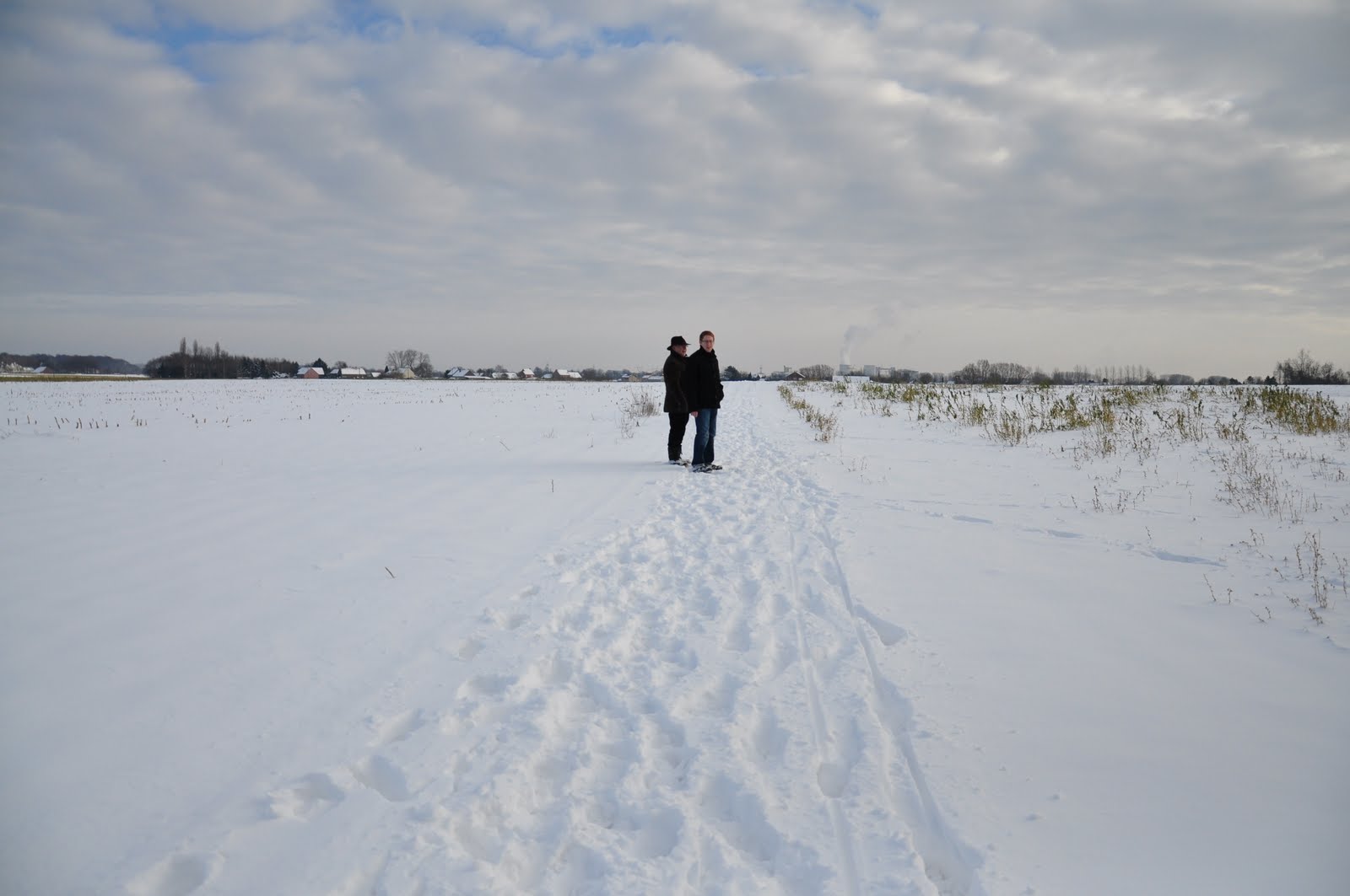 那晚我們在公婆家與親友聚餐至深夜,第二天睡到快中午才睡眼惺忪眼地吃早餐。看著窗外的好天氣,決定背上相機出外踏雪去,公公和J也一起來了。